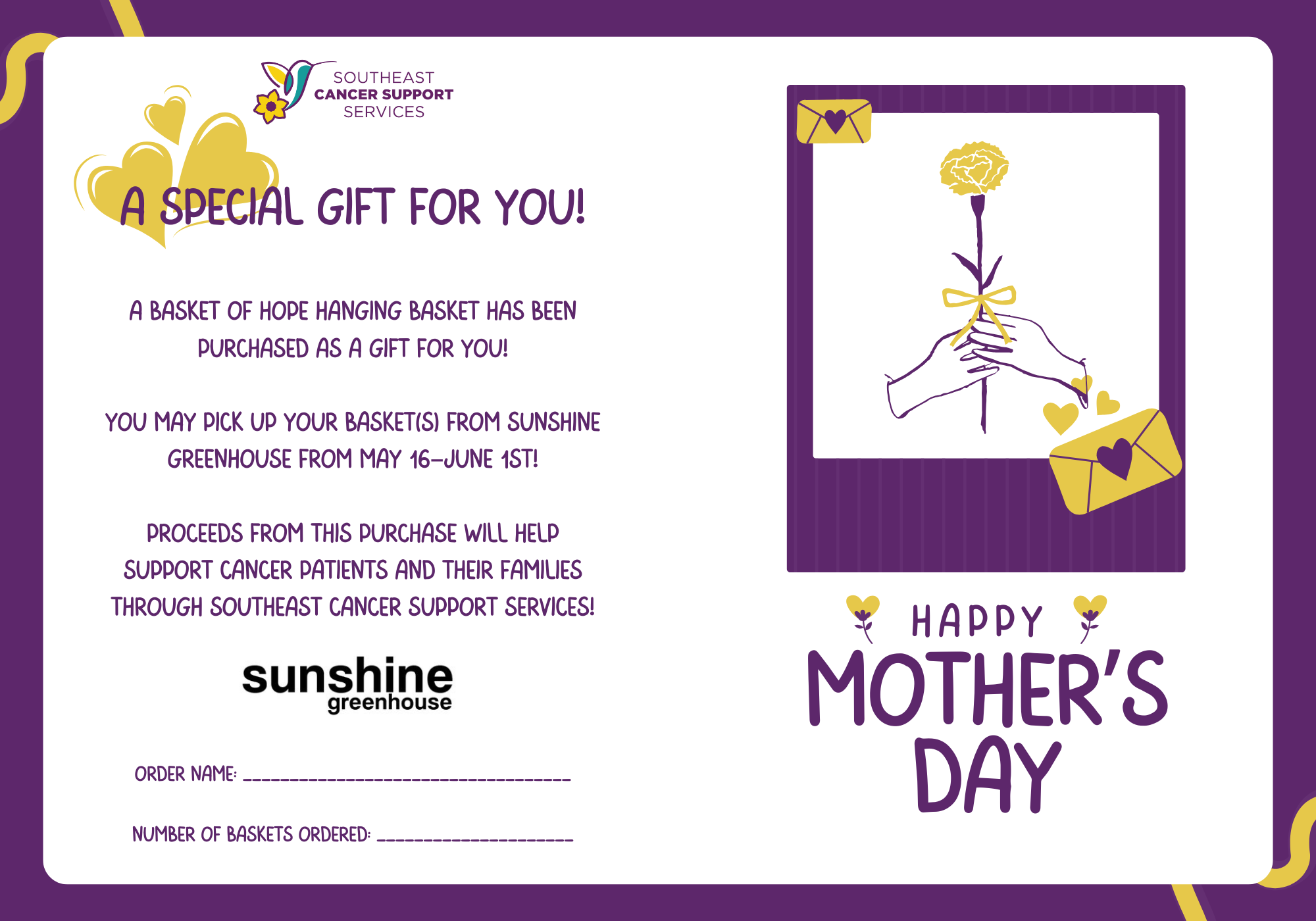 In support of Southeast Cancer Support Services (SCSS), Sunshine Greenhouse is growing Baskets of Hope. The lavender flowers symbolize serenity, calmness, devotion, loyalty, love and well-being. The yellow flowers represent friendship, happiness, positivity, warmth, happiness and joy; and to celebrate milestones. Thus, these Baskets are a symbol of hope.