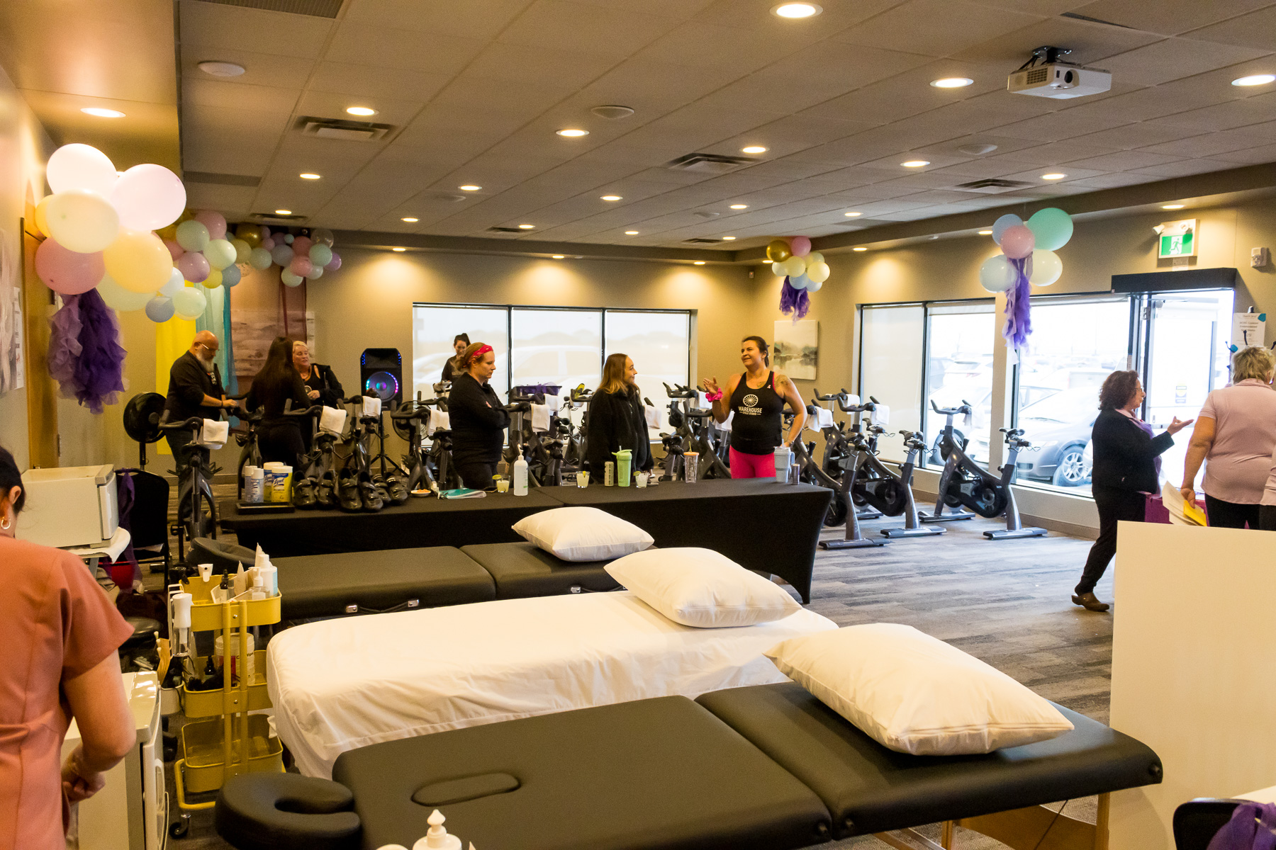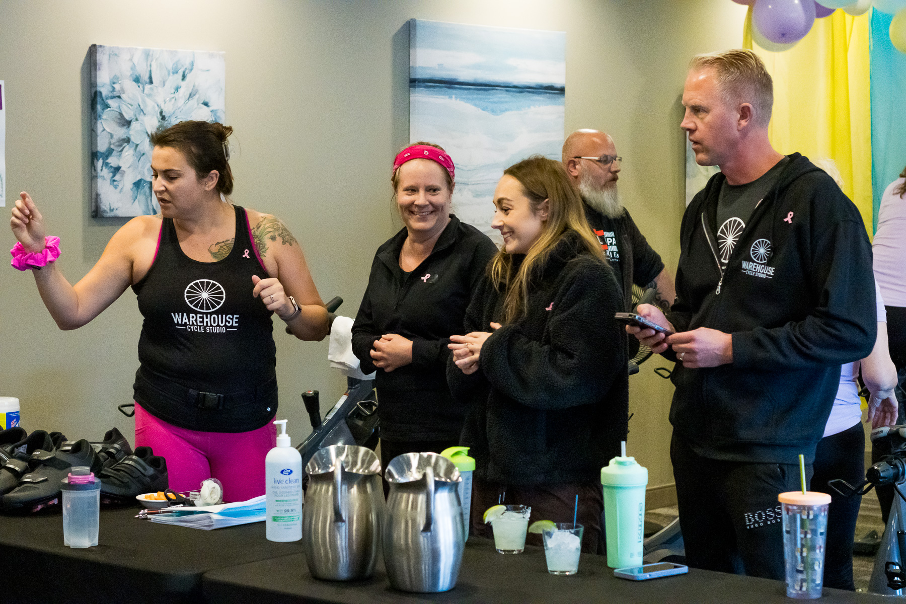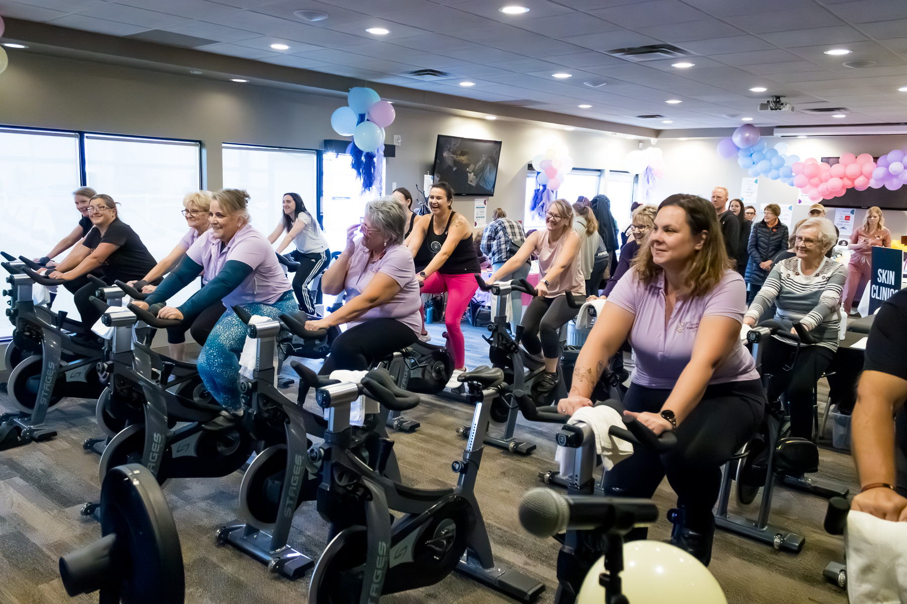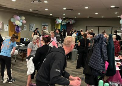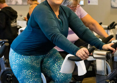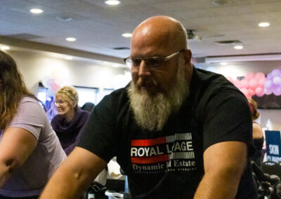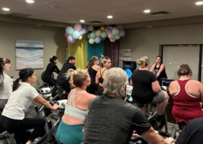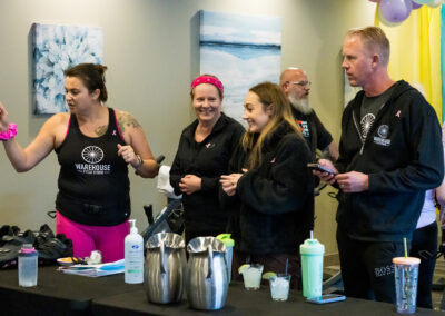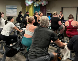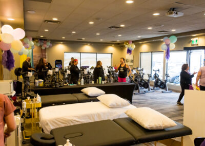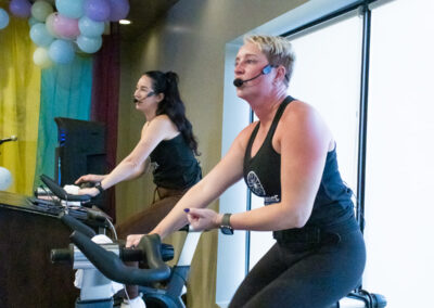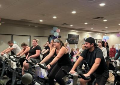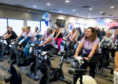 Smitty’s banquet hall was filled with 21 bikes and riders with Warehouse Cycle Studio leading the sessions, massage tables with staff from SKIN clinics offering mini facials to participants, Smitty’s staff serving Bellinis after each spin, Supplement King providing energy drink samples, and many donated prizes from local businesses. The evening began with a Mini Spin, where cancer survivors and caregivers were honored for their journeys. Following that, Warehouse Cycle Studio led the way with another 5 sold out spin classes of enthusiastic riders. The energy in the room was electric!
