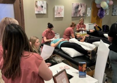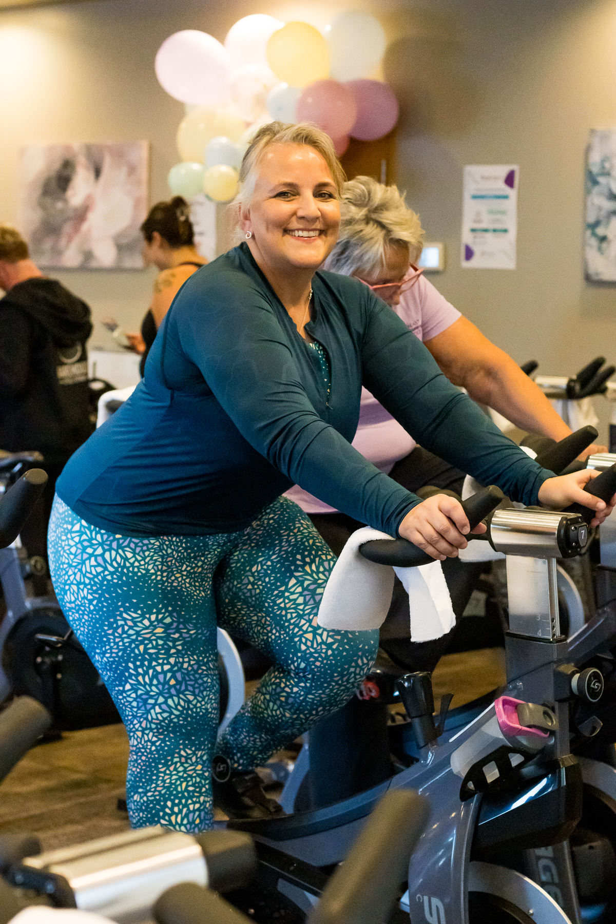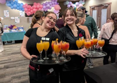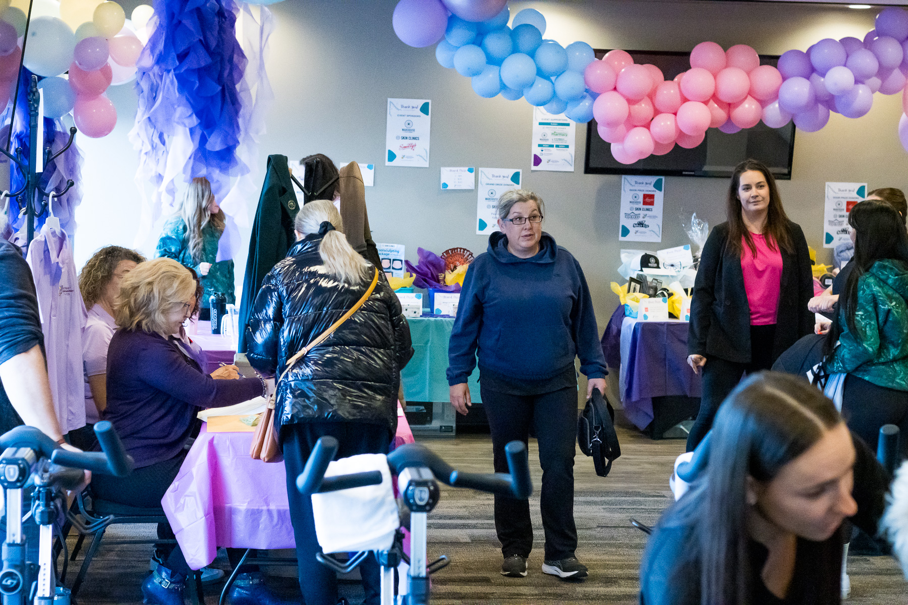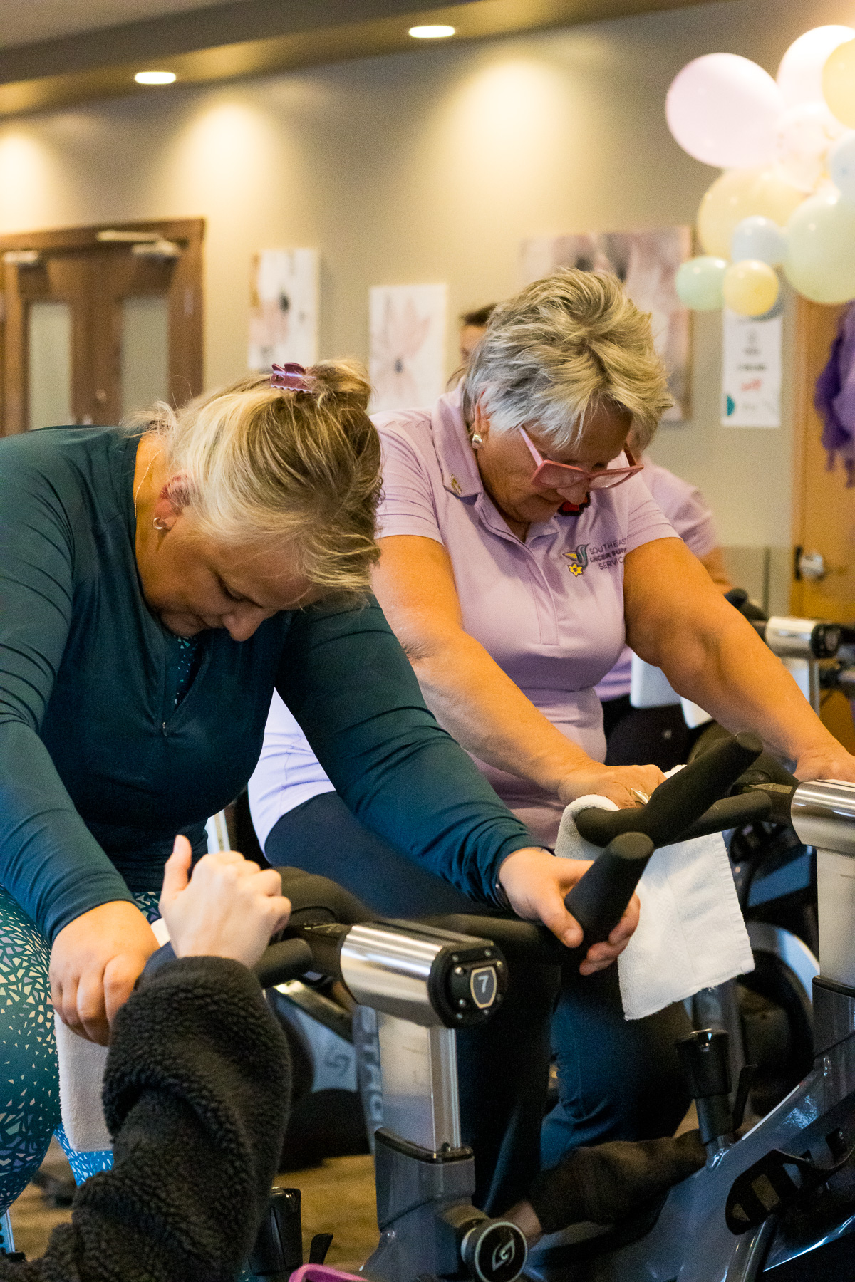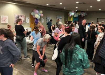 Smitty’s banquet hall was filled with 21 bikes and riders with Warehouse Cycle Studio leading the sessions, massage tables with staff from SKIN clinics offering mini facials to participants, Smitty’s staff serving Bellinis after each spin, Supplement King providing energy drink samples, and many donated prizes from local businesses. The evening began with a Mini Spin, where cancer survivors and caregivers were honored for their journeys. Following that, Warehouse Cycle Studio led the way with another 5 sold out spin classes of enthusiastic riders. The energy in the room was electric!