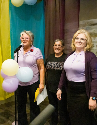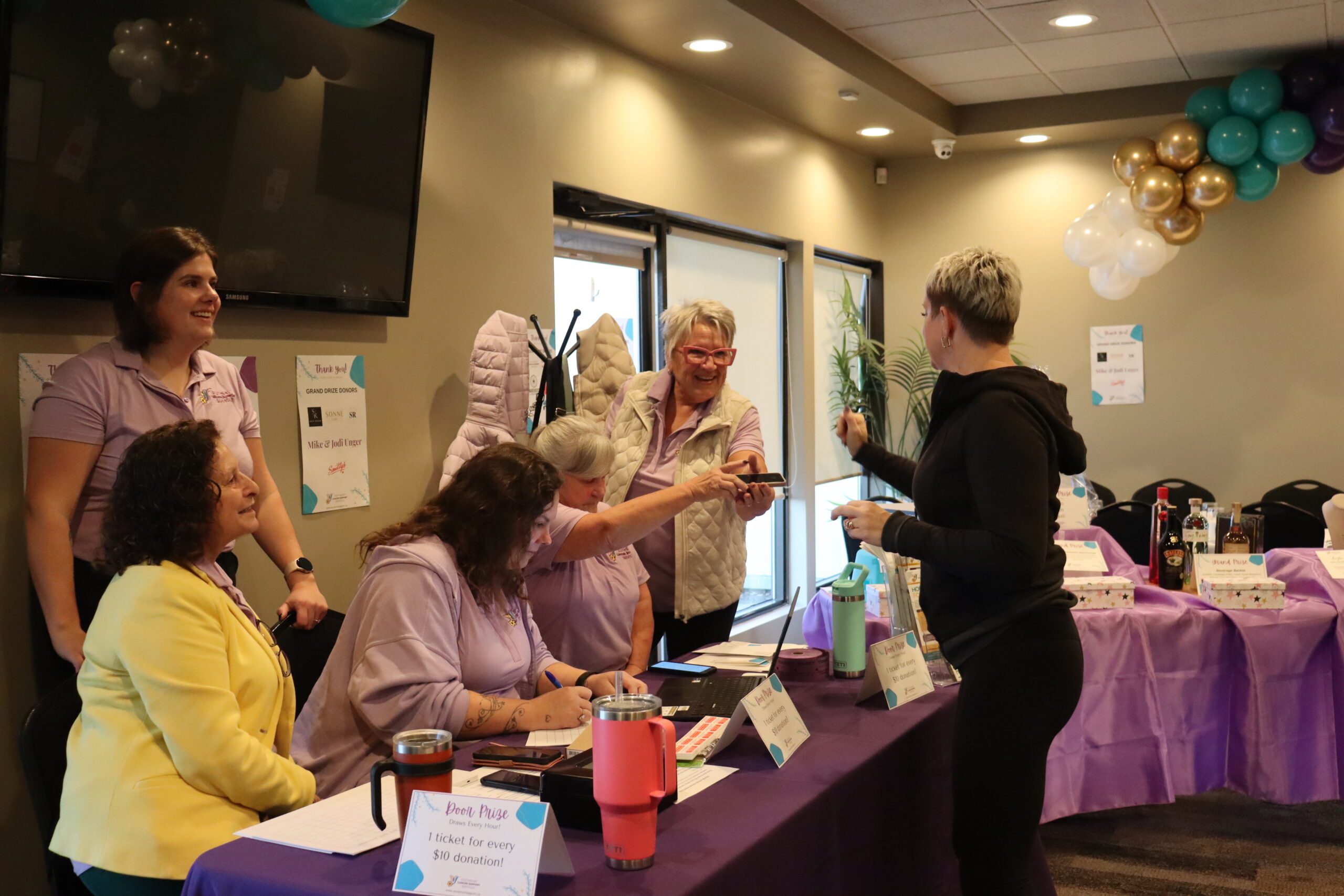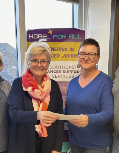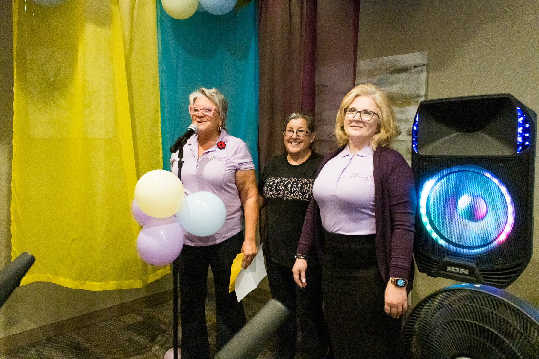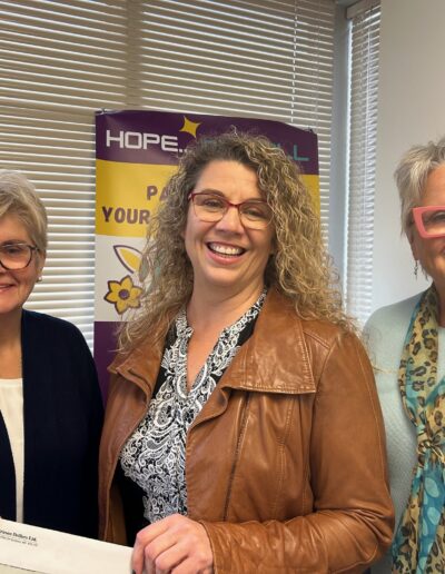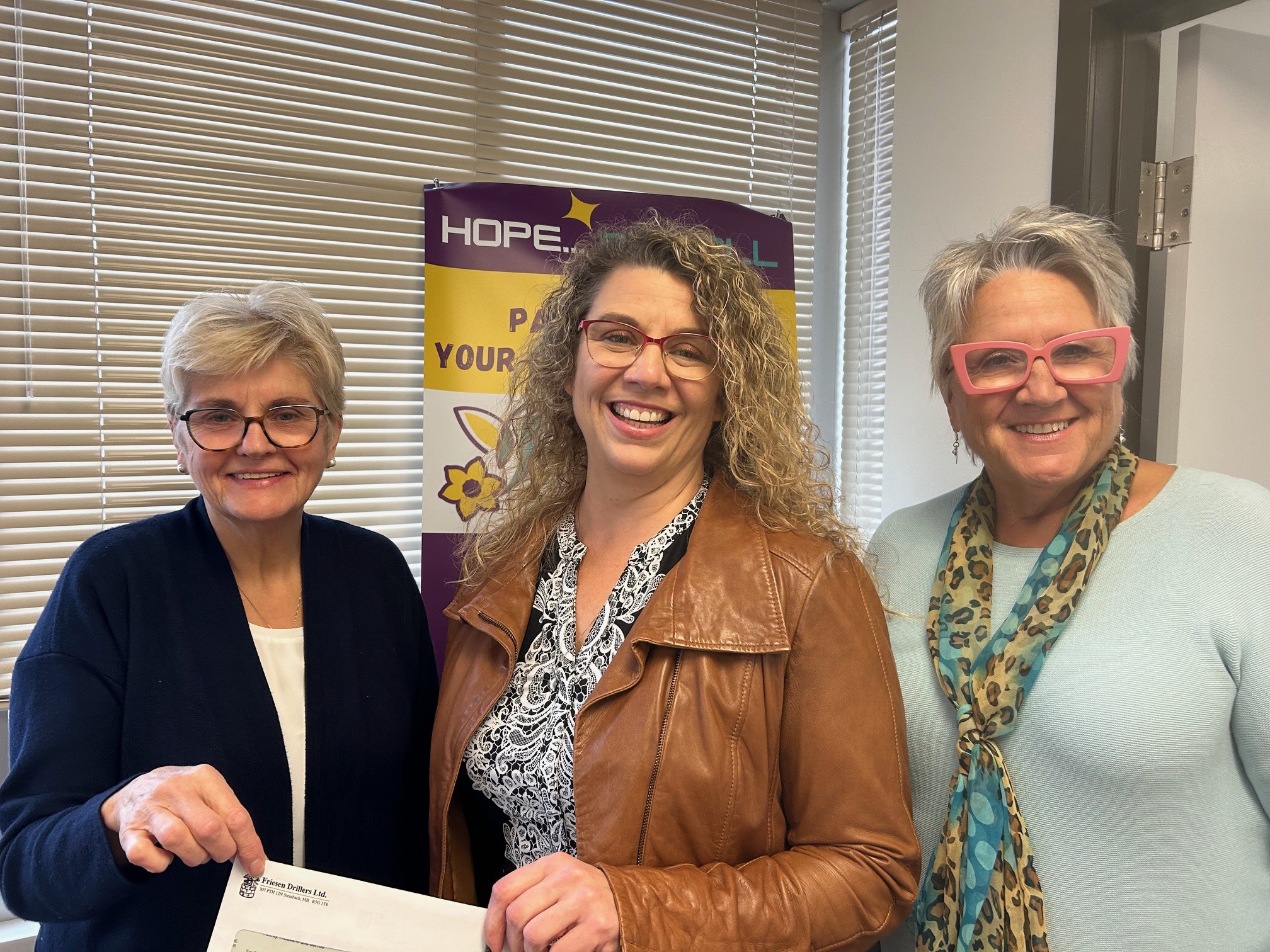 Kim Friesen of Friesen Drillers presents a 25,000 donation to Cindi (ED) and Heather (Board Chair).