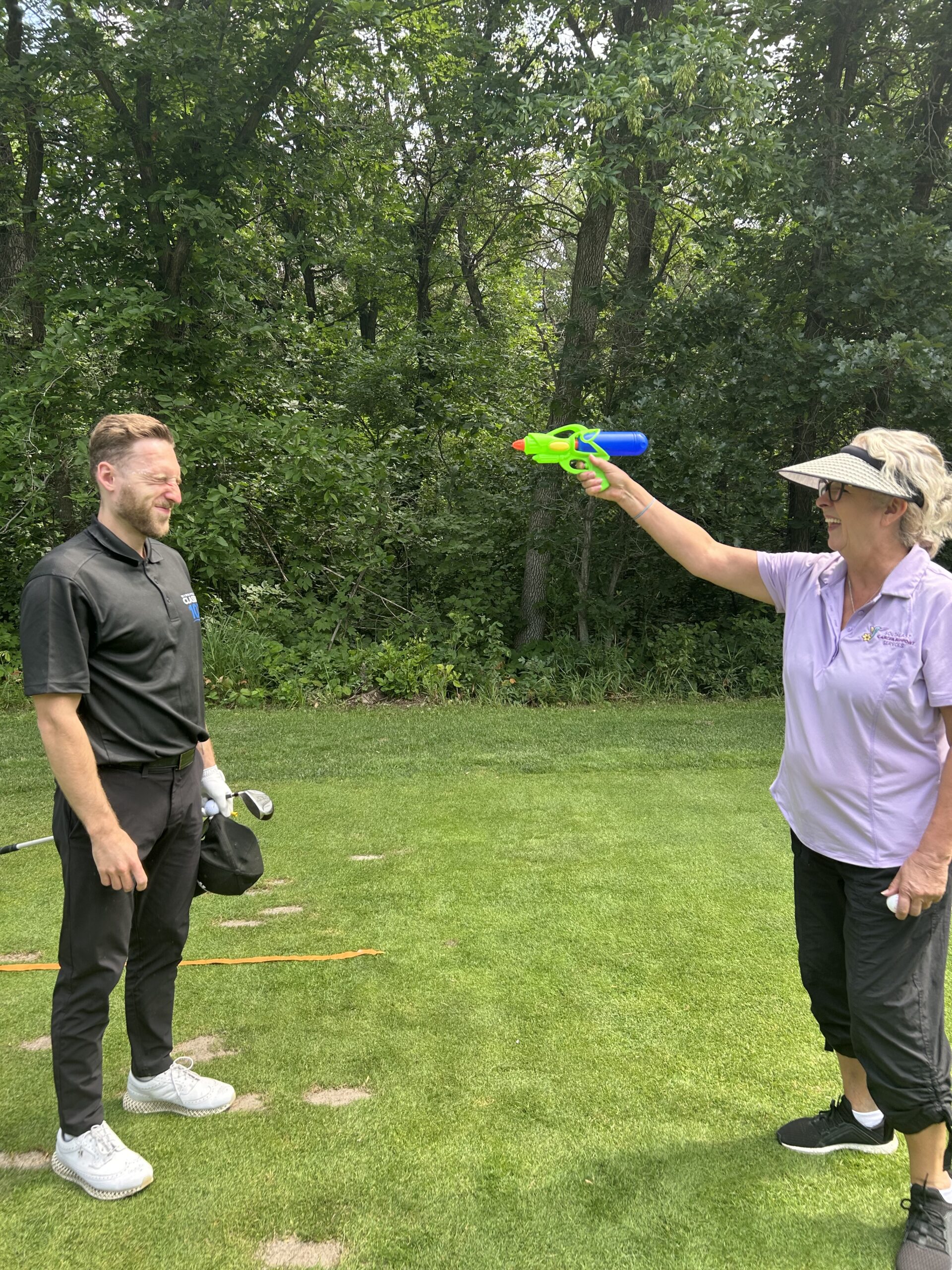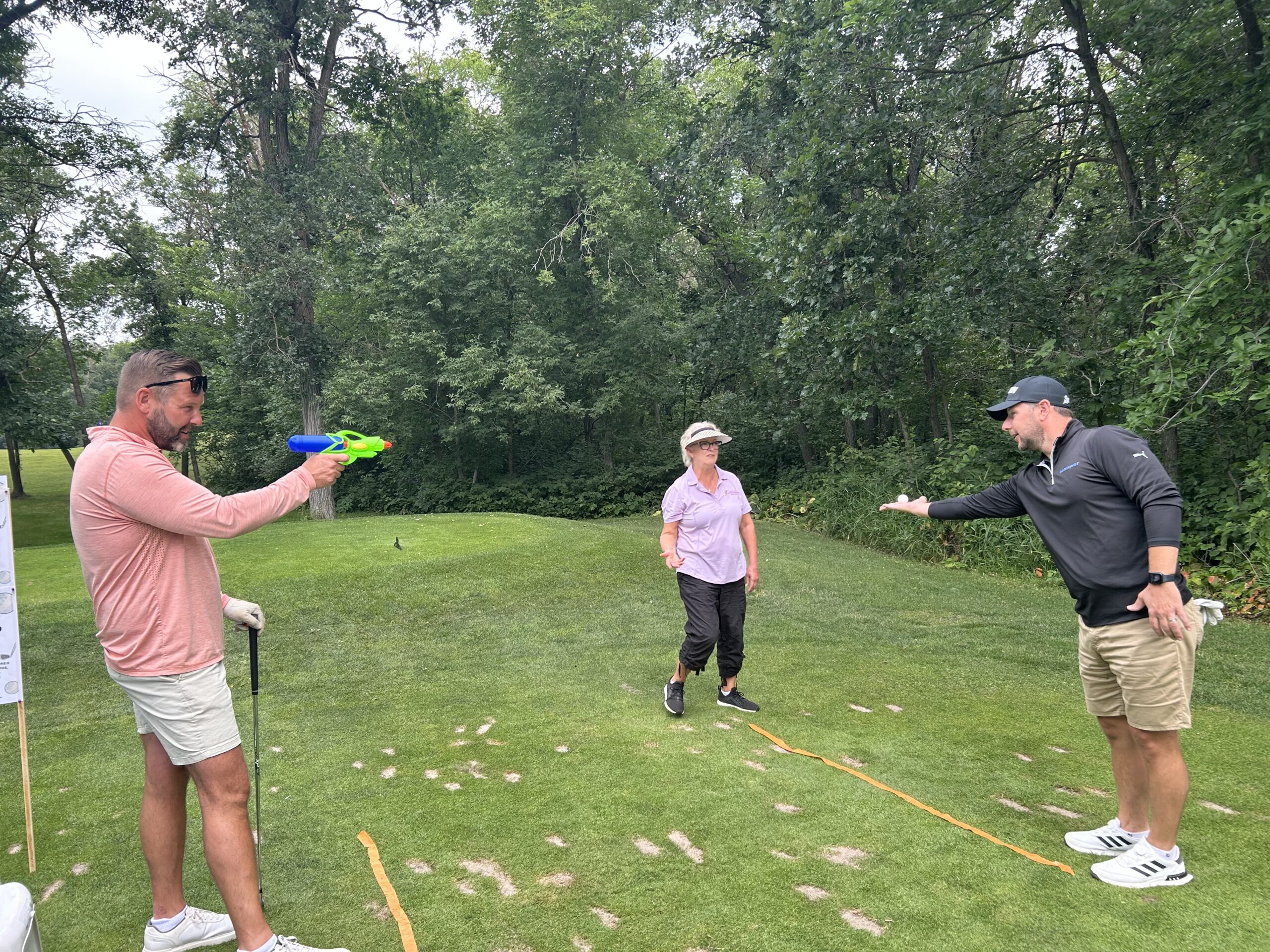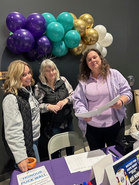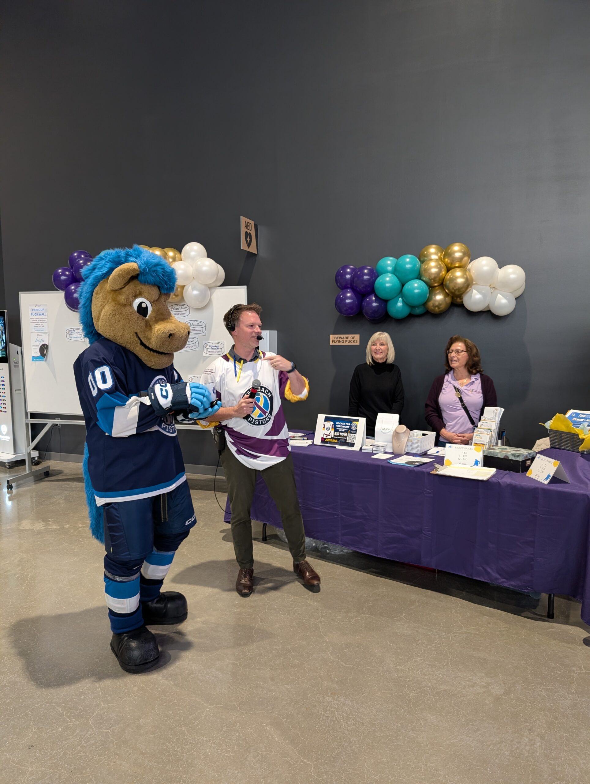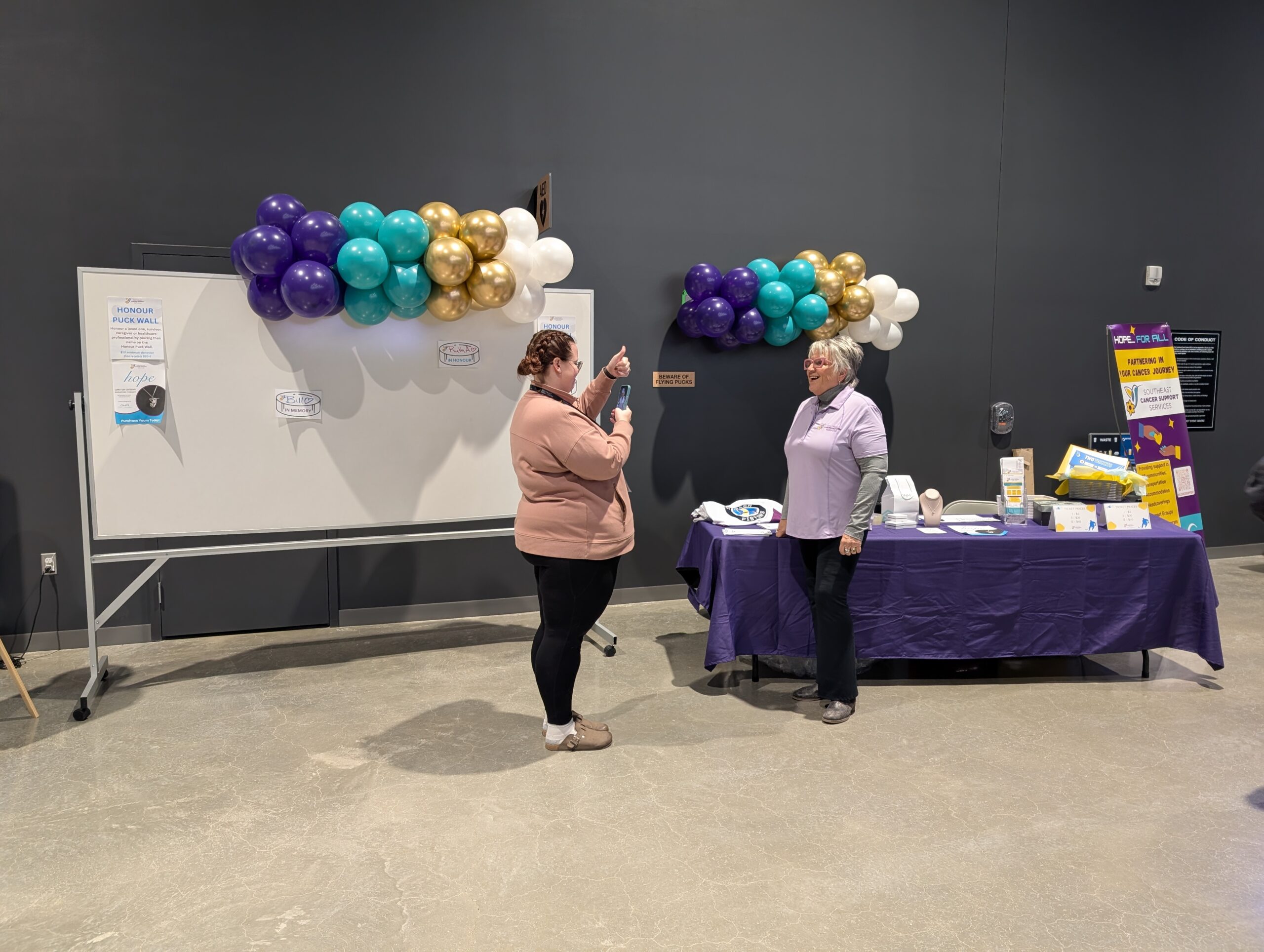 Kim Friesen of Friesen Drillers presents a 25,000 donation to Cindi (ED) and Heather (Board Chair).